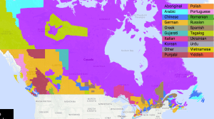 One other part of the country that stands out is the Northwest Territories (near the top of the map). You probably could have given me a dozen guesses and I wouldn’t have said “Arabic” as the most commonly spoken language after English/French.